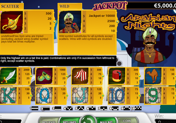 Самый дорогой символ автомата Arabian Nights онлайн это изображение Араба с красным рубином в руке. Комбинация из пяти таких символов принесет джекпот и ставка будет увеличена 10000 раз! Кроме того Араб - дикий множитель, а значит он не только сыграет в любой комбинации, но у удвоит ее стоимость!