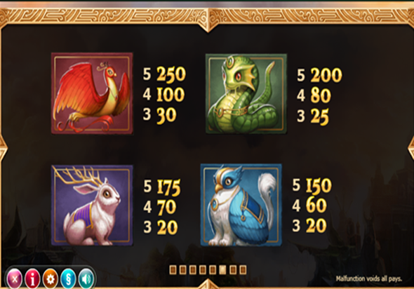 Роскошная красная птица принесет игроку самые щедрые бонусы. Даже три изображения, которые выстроились в ряд способы увеличить ставку в 30 раз. 4 картинки дадут множитель равный 100. А полная линия из красных символов подарит игроку 250 ставок на счет в фишках.