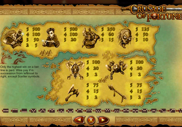 Онлайн слот Crusade of Fortune без регистрации порадует поклонников фэнтезийных стратегий и баталий. Компания Net Entertainment, которая является разработчиком слота, сделала всё возможное, чтобы гемблер полностью погрузился в атмосферу игры. При запуске автомата вы увидите 5-и барабанное игровое поле с 20-ю линиями. Количество этих линий вы сможете поменять кнопкой Bet Lines. Как и многие автоматы компании NetEnt, к примеру, игровой автомат Книжки, этот видео слот онлайн предусматривает два режима игры: ручной (барабаны запускаются большой круглой кнопкой по центру панели) и автоматический с возможностью выставить количество спинов (кнопка Auto). Оценить интерфейс, геймплей и общие характеристики можно, если играть в игровой автомат Крестовый Поход Удачи бесплатно.