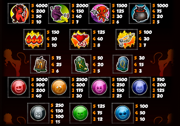 Символ очаровательной зеленоглазой дьяволицы принесёт вам максимальный выигрыш - 4000 монет. Для этого игроку предстоит собрать на одной активной линии сразу 5 изображений милой чертовки. Азартный аппарат Devil’s Delight без регистрации начислит вам выплаты уже за две одинаковых картинки с дьяволицей. То же самое касается всех старших символов.