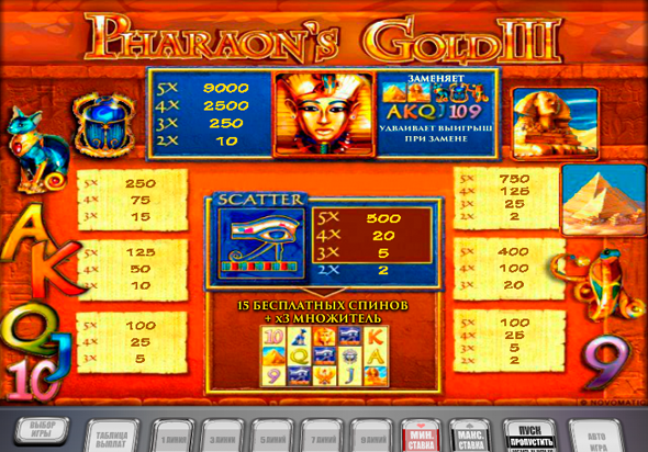 Чтобы начать в аппарат Фараон 3 играть бесплатно, нужно знать и понимать значение кнопок: