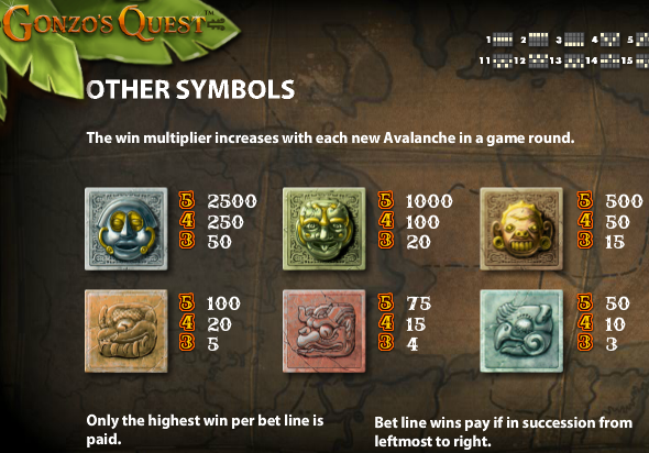 Самый дорогой символ в онлайн аппарате Gonzo’s Quest это серая плита с высеченным изображением маски шамана. Три таких изображения принесут на счет количество условных фишек, равное ставке X50, четыре – X250, а пять – X2500. Это не рекордная сумма, не забывайте про коэффициенты.