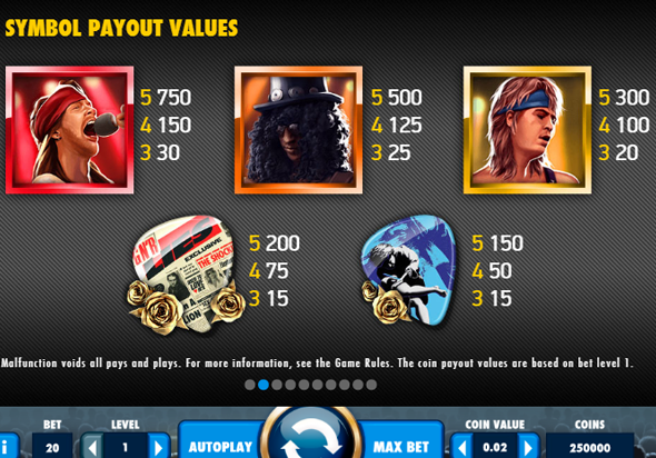 Самый дорогой символ автомата Guns N’ Roses бесплатно - это конечно изображение легендарного солиста Эксл Роуза, полная линия этих изображений увеличит ставку на линию в 750 раз, четыре солиста – в 150, а три – в 30 раз. Следующими по стоимости идут гитарист Слеш и баз-гитарист Дафф