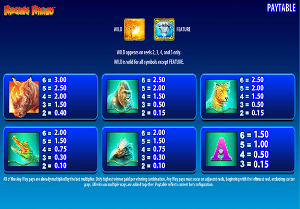 Некоторые символы могут принести выигрыш, даже в короткой комбинации из двух картинок. Главный герой Носорог подарит 0.4 ставки за подборку из двух его изображений, за три дается полторы ставки, за пять две с половиной и при полной комбинации из шести персонажей множитель достигает трех.
