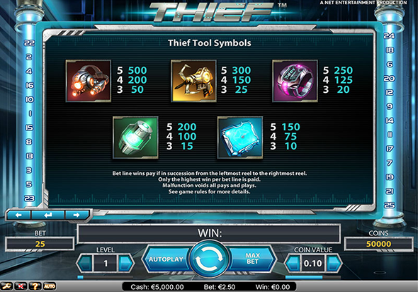 Символы на барабанах – инструменты вора. В его инвентаре можно найти смарт часы, сенсорные планшеты, ключи для взлома замков и многое другое. К оформлению слота художники подошли изобретательно, именно поэтому аппарат считается одним из известных.