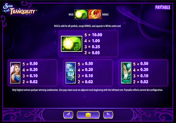 В игровом аппарате Sea of Tranquility стандартно 5 барабанов и 30 игровых полос, при этом уменьшить их количество невозможно. Слот хорошо подойдет хайроллерам, так как поставить на одну полосу в одном раунде можно до 5 евро, таким образом всего за спин риск идет на 150 у.е.