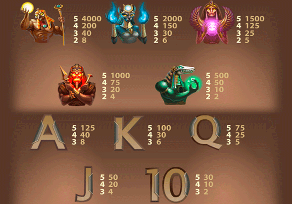 Наиболее высокооплачиваемым символов автомата Egyptian Heroes является изображение египетского бога Солнца - Ра. Это могущественное божество способно принести до 4000 монет за 5 одинаковых картинок. Причём выплаты по нему, как по одному из старших символов, начинаются от 2 символов.