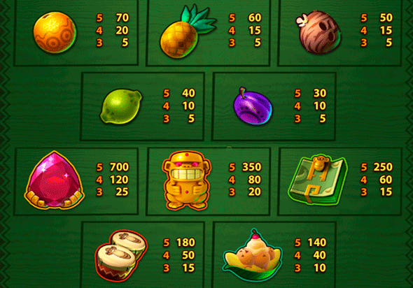 Яркие и весёлые картинки будут сопровождать вас всю игру. Ведь символы, которыми располагает аппарат Вперёд Бананы на фишки, полностью поддерживают тематику экзотических островов и своей красочностью не уступают картинкам слота Gemix. Итак, на игровых барабанах вы увидите сочные тропические фрукты, а также более интересные денежные символы: пачка денег, золотая статуя обезьяны и большущий рубин. Оценить стоимость каждого из них можно в игровом меню «i».