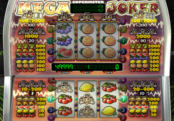 Количество линий на автомате Мега Джокер онлайн изменить не получится, их всегда 5 и на первом и на втором экране. Начинается игра на нижнем экране, нажатием на кнопку «Spin», которой также можно и моментально останавливать барабаны. При наличии одной из комбинаций, стоимость которых для удобства выведена на панель аппарата, Вы получаете шанс сыграть на втором экране. Стоимость комбинаций здесь намного выше, и появляется возможность увеличивать ставку. Чтобы залить на счет кредиты, нажимайте кнопку «Collect».