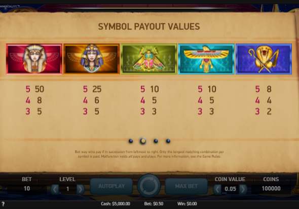 Изображения с Клеопатрой и Фараоном самые выгодные – они выплачивают от 5-ти и до 50-ти призовых ставок.