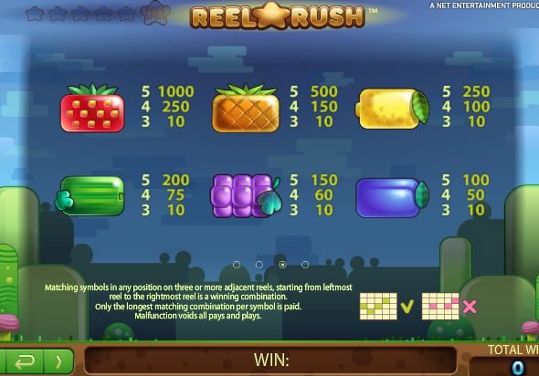 Самым дорогим символом автомата Reel Rush бесплатно является леденец в виде клубнички. За пять таких картинок на игровом поле вам светит 1000 монет выигрыша. При этом не стоит забывать, что удачно сложившаяся комбинация открывает дополнительные позиции на поле и даёт фри спины.