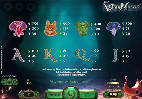 Игровой автомат 3D Джин бесплатно - это новый представитель производителя NetEnt. Девиз автомата «Пусть сбудутся ваши желания» говорит о многом. Действительно, во время игры может произойти довольно неожиданные события - как по волшебству возникают фриспины и дикие символы. В автомате 20 активных линий которые изменить нельзя. В ставке же можно менять не только размер, но и номинал, что позволяет значительно увеличить ее диапазон. Основной бонус спрятан в лампе, которая находится в нижнем правом углу автомата – с появлением на барабанах автомата Wish Master хотя бы одного пергамента с волшебной лампой из нее вылетает джин, который запускает 10 фриспинов и специальную функцию. Это может быть дикий символ, расширяющийся дикий символ, внезапно появляющиеся дикие символы, выигрышные коэффициенты и т.д. Повторное появление пергамента добавит к счетчику 5 вращений и одну функцию (до трех).